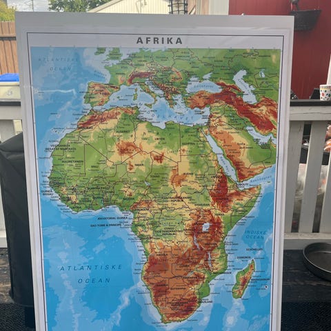 Den indrammede genstand er et dekorativt kort, som viser forskellige geografiske lokationer med illustrationer i farver. Det er indrammet i en enkel træramme, som har målene 54x42 cm. Kortet indeholder tekst og billeder, der ligner lande, bjerge og historiske figurer. Bagsiden af rammen viser en simpel beskyttelse af pap, der er holdt sammen med tape, hvilket understøtter kortets stabilitet inden i rammen.