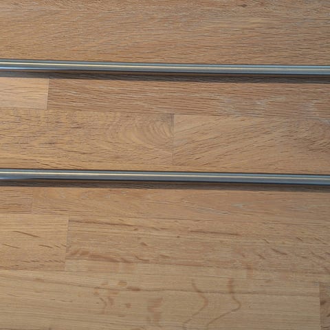 Dette er en håndklædeholder, som måler 59,5x12 cm. Den består af to parallelle stænger forbundet med to mindre tværgående stænger. Den er designet til vægmontering, hvilket gør den ideel til badeværelser, hvor der er behov for opbevaring af håndklæder. Konstruktionen ser robust ud og er lavet af metallisk materiale, som giver en moderne og funktionel løsning til opbevaring.