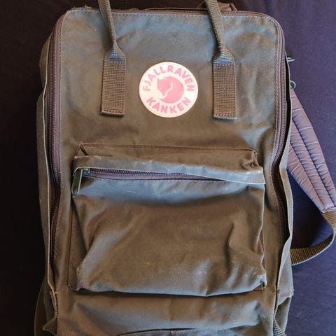 Denne rygsæk er en Fjällräven Kånken, kendt for sit klassiske design og holdbare materiale. Den er i en dyb blå farve og har justerbare stropper, et hovedrum med lynlås samt en mindre frontlomme med lynlås og et håndtag på toppen. Fjällräven logoet er synligt på fronten. Størrelsen på rygsækken er 41x33 cm, hvilket gør den praktisk til daglig brug eller skole. Tags: rygsæk, Fjällräven, Kånken, blå, taske.
