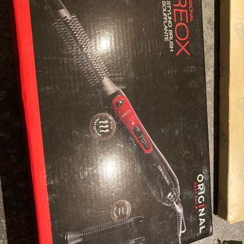 Dette er en elektrisk varmluft krøllejern, der måler 35 cm i længden. Den har en cylindrisk form med børster rundt om, og den er designet til at style og tørre håret med varm luft. Den leveres med en ledning og et EU-standard stik. Den har justerbare indstillinger for varme og hastighed. Børsten er primært sølvfarvet med sorte detaljer.