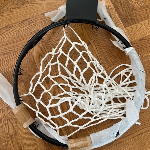 Basketballkurv i orange med tilhørende hvidt net og monteringsbeslag inklusive bolte og møtrikker. Kurven er designet til udendørs brug og kan monteres på væg eller stander.