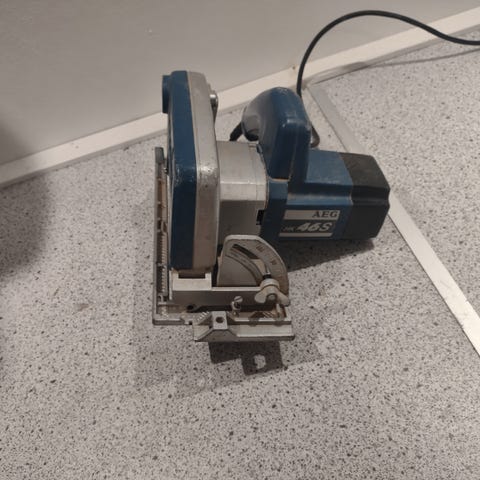 AEG HK 45 rindsav med modelnummer 228 208 AU1. Maskinen er beregnet til 230V strøm og har en effekt på 3,3A. Den har en rotationshastighed på 5700 omdrejninger pr. minut. Leveres med tilbehør og original emballage.