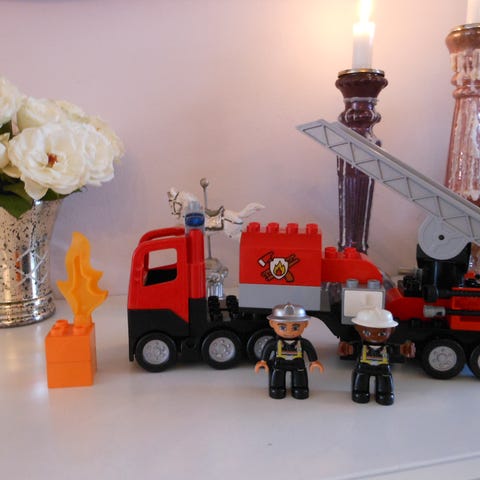 Duplo brandbil med brandmand, flamme og slange, der er udtræk på stigen og hvis man skifter batteri kan der komme lyd og lys i sirenen