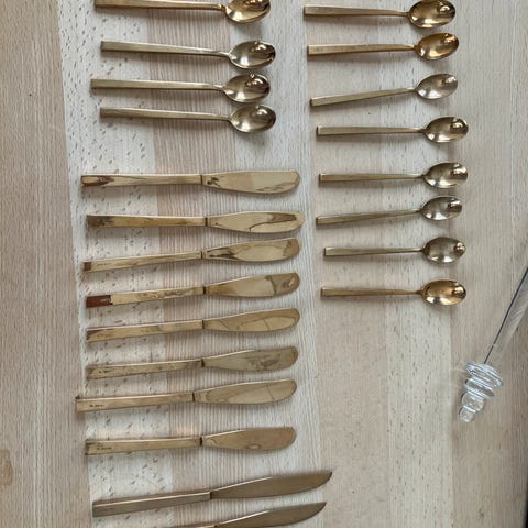 29 dele, ok stand, 1 ske med skader på messing, men ok.