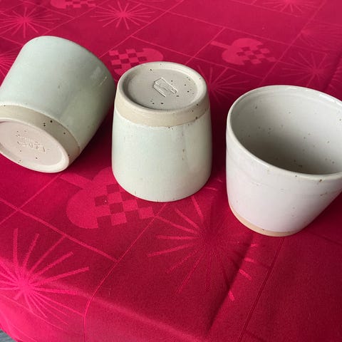 5 ø-kopper fra Bornholms keramik- 2 lyserøde, 2 lyseblå, 1 to-farvet