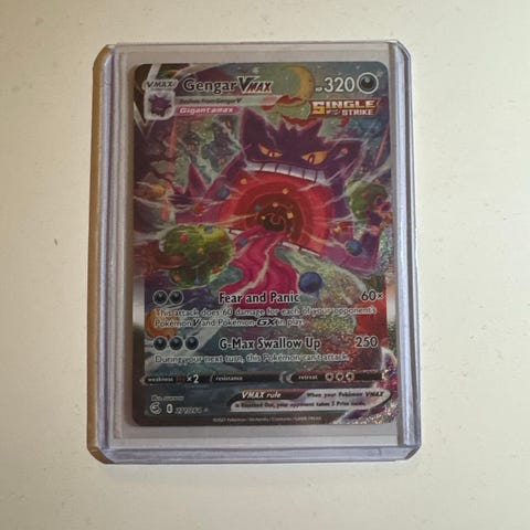Pokémon Glaceon VMAX samlekort med illustration af Glaceon. Kortet indeholder evner og angreb med angivet skade og energi krav. Billedets bagside viser typisk Pokémon kortdesign med Pokéball. (Eller BYD)