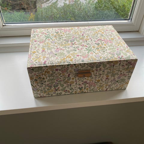 Hjerteformet smykkeskrin i liberty stof. Ubrugt. Købt i Stilleben. Kvittering haves.