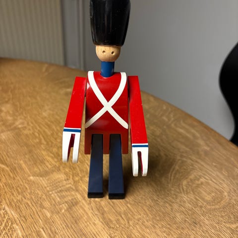 Kay Bojesen Garderfigur med tilhørende vagttårn og dansk flag. Figuren er lavet af træ og malet i klassiske farver, herunder rød, hvid og blå. Produktet er dekorativt og kan bruges som pynt i hjemmet.