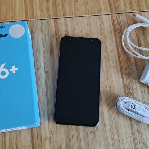 Samsung Galaxy j4+mobiltelefon med 32 GB hukommelse. Enheden er sort og designet til almindelig brug med fokus på lagringskapacitet. Og der kan følge et ladestik og et cover med