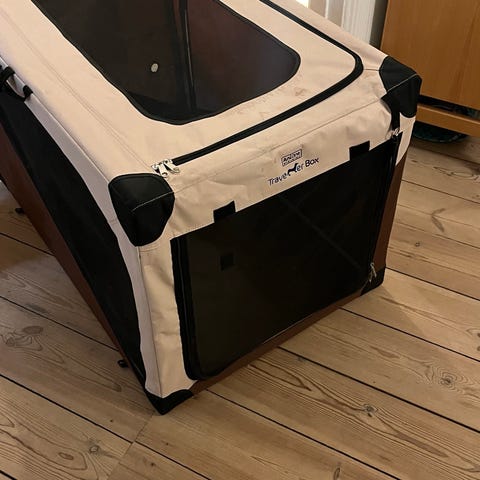 Spacious soft pet travel crate in excellent condition. Bought for 270 DKK, never used.