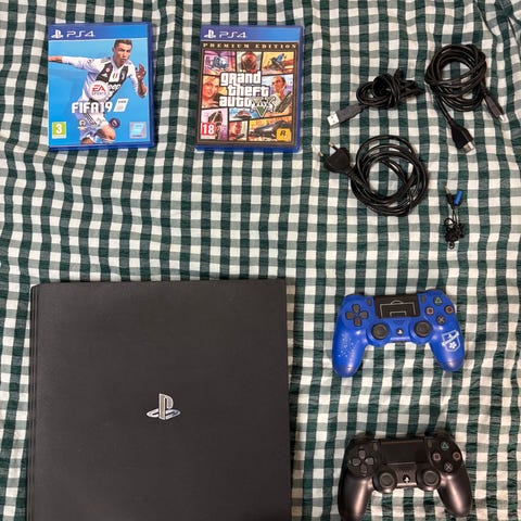 Sony PlayStation 4 Pro med een controller, inklusiv VR headset med tilhørende kamera og to bevægelsescontrollere. Sættet indeholder headset, kamera, to controllere, kabler og et spil. .