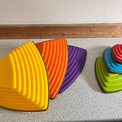 Gonge balancekugler: 6 stk, kan både bruges som små runde trædesten til at bygge en balancebane eller omvendt som vippende balanceøvelse