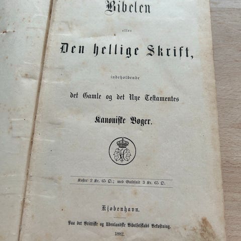 Den er med gotisk skrift og indeni står "Kjøbenhavn bibelselskabet for Danmark, St. Bagges Bogtrykkeri 1891"