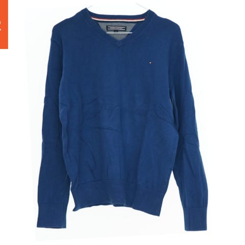 En grå sweatshirt fra Tommy Hilfiger. Trøjen har lange ærmer og en rund halsudskæring. Der er et lille Tommy Hilfiger logo på brystet. Størrelsen er angivet som L.
