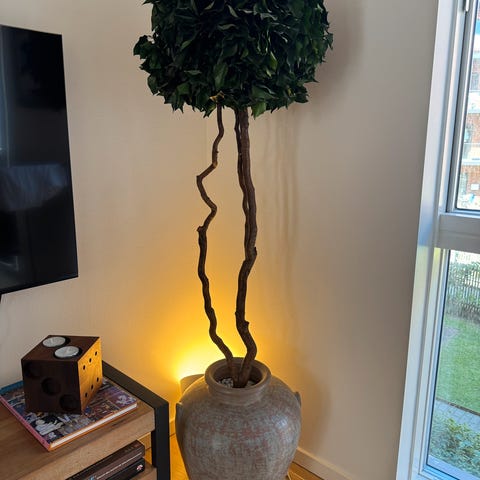 STOR indendørs krukke 90cm H x 70cm B x Diamter åbning 35cm står tungt og sikkert i vintage LOOK med stor kunstig Figentræ 210cm