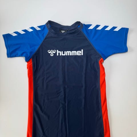 Langærmet UV-bluse i blå, med lyseblå og gule ærmer. Blusen har Hummel logo foran og bagpå samt hvidt mønster på skuldrene. Den er designet til at beskytte mod solen ved vandaktiviteter.