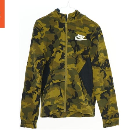 Grå hættetrøje fra Nike med langærmet design og kængurulomme på forsiden. Trøjen har en hætte og Nike-logoet er placeret øverst til højre på trøjens front.