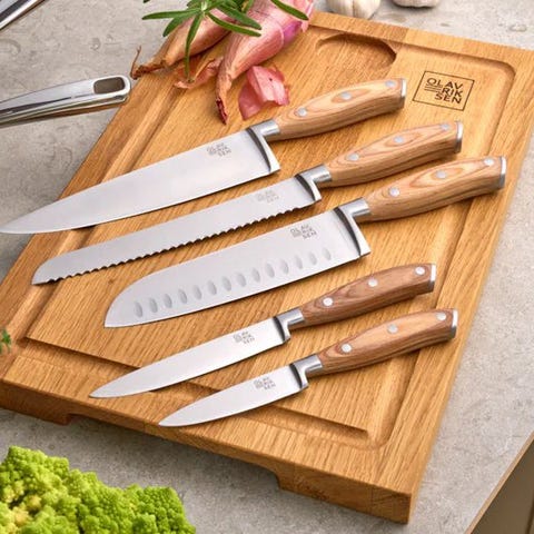 Sælger et flot og helt nyt Olav Eriksen knivsæt i høj kvalitet. Knivene er fremstillet i rustfrit stål og ligger godt i hånden med ergonomiske greb. Et solidt og stilrent knivsæt, der egner sig perfekt til både daglig madlavning og mere ambitiert køkkenbrug.