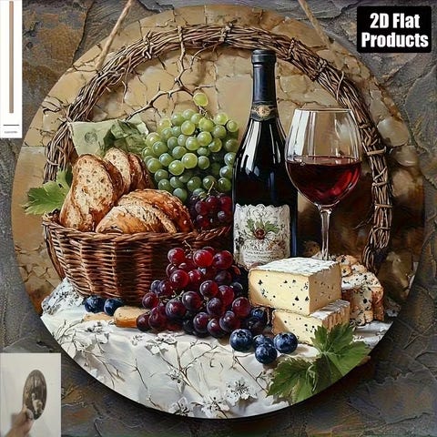 En metalplakat med en kunstnerisk illustration af en kvinde, der hælder druer i et glas vin. Plakaten har teksten 'Start the day with a smile and finish it with wine'. Plakaten er 39x27 cm i størrelse og har huller i hjørnerne til ophængning.