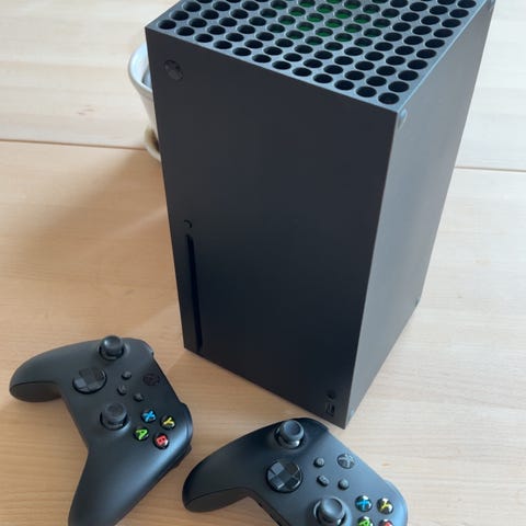 Xbox Series X konsol med tilbehør inklusive controller og strømledning.