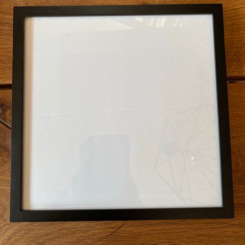 Rammen er kvadratisk med mål 32,5x32,5 cm. Den har en sort kant og en bagside af brun, kompakt karton. Der er vedhæftede metalbeslag på bagsiden til montering af et billede. Glasset foran er klart og beskytter mod støv og snavs. Rammen er velegnet til at indramme fotos eller plakater. Tags: ramme, billedramme, kvadratisk ramme