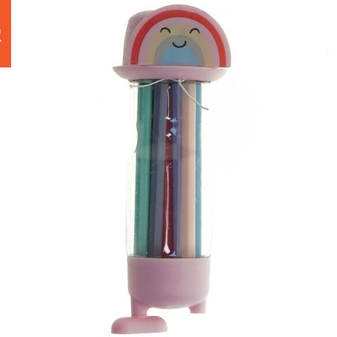 En plastkasse med 12 forskellige farver akvarelfarver og en rød pensel. Farverne inkluderer grøn, blå, lyserød, hvid, grå, sort, orange, lilla og gul. Der medfølger også en stempelpude i en separat plastkasse i en skrigende pink farve.