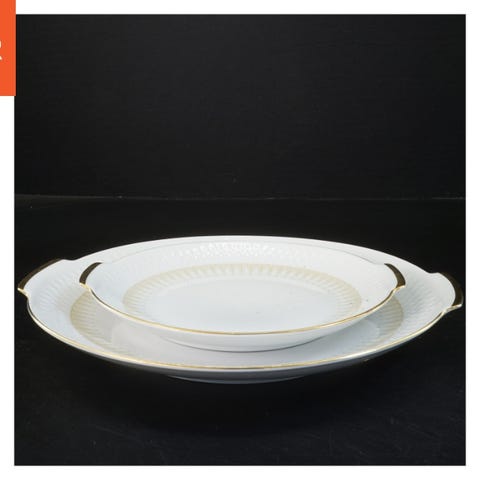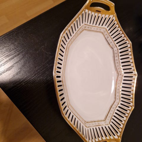 Dekorativt fad af stål i guld og sølvfarvet med banket bund