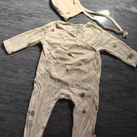 Heldragt til babyer lavet af blødt stof i en creme farve med små blomstertryk. Dragten har lange ærmer og trykknapper, der gør det nemt at åbne og lukke. Det har en kryds lukning foran og små blomster designs fordelt over hele dragten.