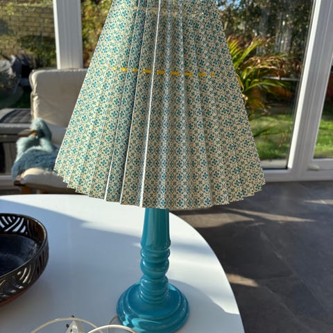 Denne bordlampe har en robust blå skærm og en fleksibel hals, hvilket gør det nemt at justere lysets retning. Lampen er monteret på en solid base med en tænd/sluk-knap. Strømtilslutning sker via en ledning med en standard stik. Lampens totale højde er 29 cm, og den kan bruge pærer op til 40W.