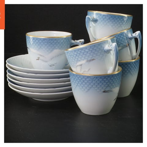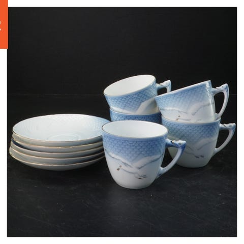 Sættet består af seks porcelænskopper og seks undertallerkener. Kopperne har en diameter på 12 cm, og undertallerkenerne har en diameter på 18 cm. Designet er præget af en blå skælmønster og dekoreret med flyvende måger, samt detaljerede guldbelagte kanter på både kopper og tallerkener.