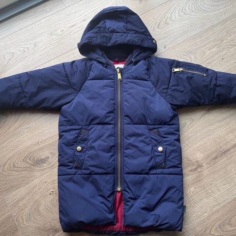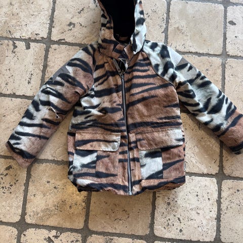 En vinterjakke i en oliven farve med en hætte kantet med lys faux fur. Jakken har en lynlås foran samt to lynlåslommer med trekant detaljer på forsiden. Ærmerne har ribstrikkede manchetter, og der er en label med mærket Molo på bagsiden nederst.