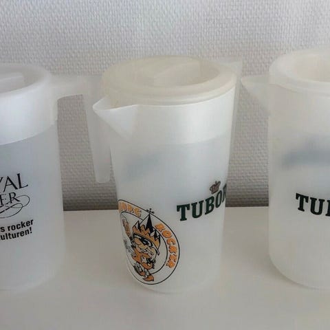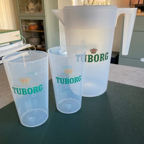 Plastik kande med TUBORG logo og design trykt på den. Den er 23 cm høj og har en hældetud og håndtag for nem brug. Designet gør kanden egnet til servering af kolde drikkevarer.