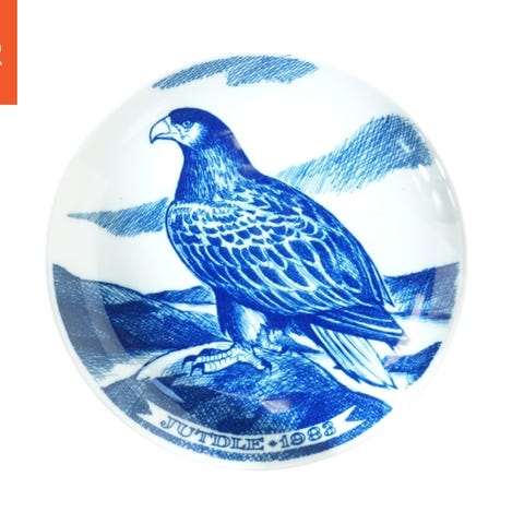 Denne porcelænsplatte har en diameter på 20 cm og viser et motiv af en falk. Platte fra 1982, er nummer 7 i serien 'Grønlandsk juleplatte', med en begrænset oplag på 2.000 stk, som angivet på bagsiden. Designet er udført af Aage Dam. Platte er dekoreret i blå nuancer på hvidt porcelæn.