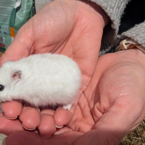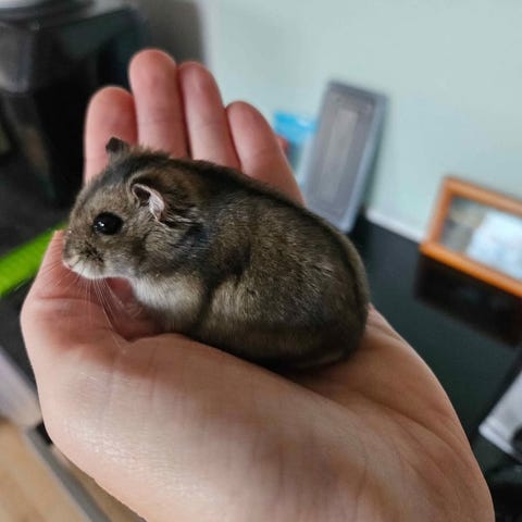 Sødt og blødt dværghamster på 6 mdr. sælges. Hun er håndtam og vil gerne op når man rækker ned i buret. Tilbehør som følger med:
