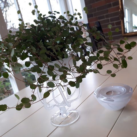 En hvid vase eller skål på fod fremstillet af keramik eller glas. Vasen har en dekorativ riflet yderside og står på en robust fod. Vasen er ideel til dekoration eller til at holde små genstande. Størrelsen er 17 cm i højde.