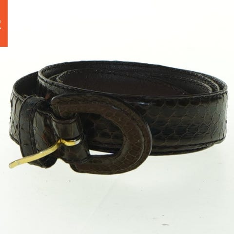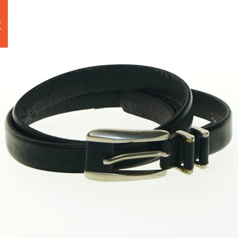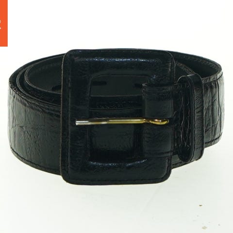 Sort læderbælte med en oxyderet metalspænde. Bæltet måler 77 cm ved det første hul.