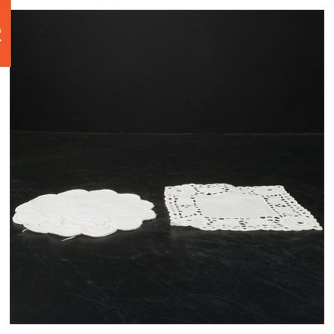 To hvide hæklede servietter med forskellige mønstre. Den ene er rund og den anden er rektangulær. Servietterne kan bruges som dekoration eller til beskyttelse af overflader. Størrelsen er Ø 9 cm.
