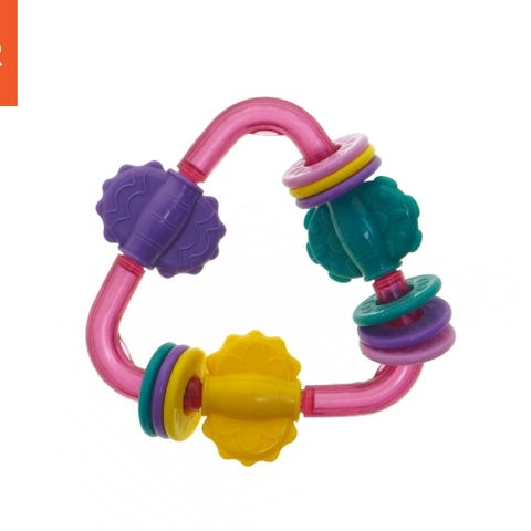 Dette er en farverig ranglebold til børn, der har en diameter på 9 cm. Bolden har en rød base med flere indbyggede små kugler i forskellige farver, inklusive gul, blå og hvid, som varierer i udtryk og funktion. Den er designet til at tiltrække og engagere børn ved at lave raslende lyde, når den rystes. Ranglen er lavet af plastikmateriale, ideel til små børns leg og udvikling af deres motoriske færdigheder.