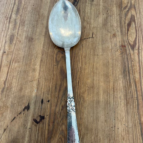 Denne antikke suppeske er fremstillet i metal med et detaljeret mønsteret skaft. Den måler 18 cm i længden. Skeen viser tegn på patina, hvilket giver den en vintage charme. Den skålformede del har en gulnet finish, mens skaftet har et dekorativt mønster, muligvis graveringer.