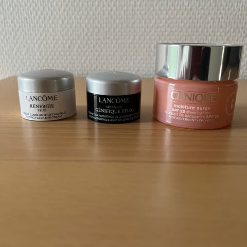 Dette er en Clinique All About Eyes øjencreme i en 6 mm størrelse. Produktet er pakket i en gennemsigtig krukke med en sølvfarvet låg. Cremen er designet til at reducere hævelser, mørke rande og fine linjer omkring øjnene.