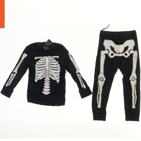Dette er et sæt med en sort langærmet trøje og matchende bukser, begge med et skeletdesign på forsiden. Trøjen viser ribbenene, mens bukserne prydes af et hofte- og bendesign i hvidt.