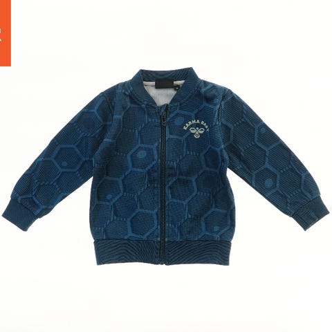 Denne børnejakke er blå og har en lynlås foran. Ærmerne har et hvidt og blåt zigzag-mønster på skuldrene. Jakken har en ribkant med gule striber ved håndleddene og taljen. Brystet er dekoreret med Hummels bi-logo i gul farve.