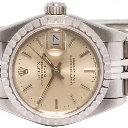 Den sølvfarvede skive er udsmykket med diamantindeks, som understreger urets eksklusive karakter og giver et sofistikeret spil i lyset. Datovisningen kl. 3 med cyclops-linse tilføjer praktisk funktionalitet uden at gå på kompromis med elegance.