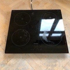 LG induktion kogeplade med sort glasoverflade. Kogepladen har fire kogezoner og er designet til indbygning i køkkenbord. Overfladen har brugsspor, herunder ridser og et beskadiget hjørne, som ses på billederne.