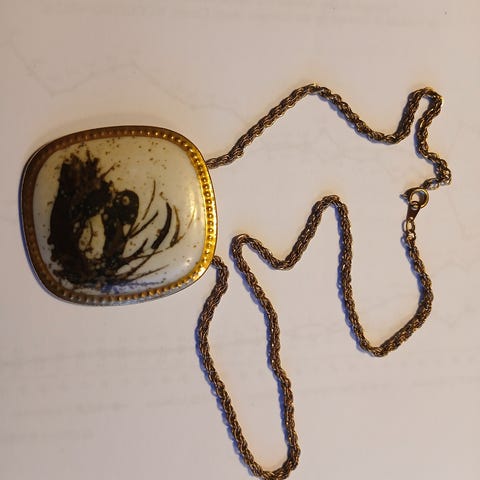 Halskæde af sølv med en længde på cirka 68 cm. Den har et enkelt kædestykke, der bærer et rundt vedhæng med indgraveret mønster på forsiden. Bagsiden af vedhænget er glat og kan have mindre indgraveringer. Ideel til hverdagsbrug eller som gave. Kan bæres alene eller kombineres med andre smykker.