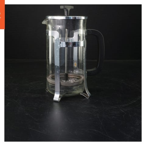 En fransk presse kaffekande med en højde på 19 cm. Kanden har en metalramme og en glas cylinder til brygning af kaffe. Den har en sort plastikhåndtag og et låg med en kugleformet knop for at lette betjeningen. Denne type kaffebrygger er ideel til at lave friskbrygget kaffe.