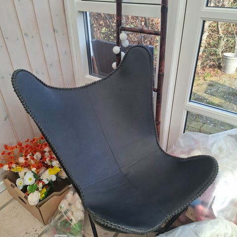 Hyggelig flagermus stol,som ikke fylder så meget.Skøn at sidde I.En fejl i læderbåndet,kan fixes..Derfor nedsat fra 500 til 350 kr