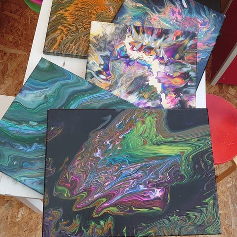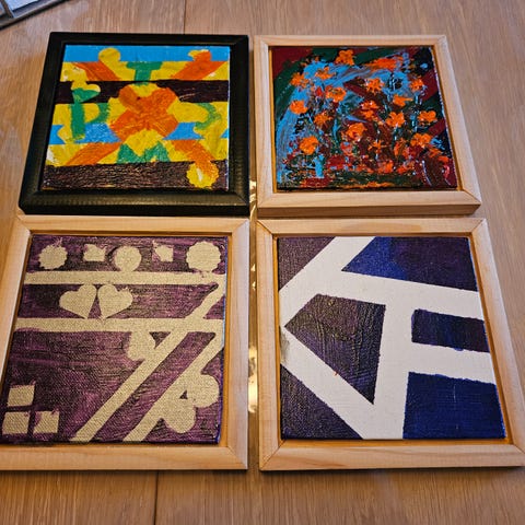 Fire malerier / billeder. 15 x 15 cm. 100 kr. pr. sæt a 2 stk. Ingen ophængningsbeslag, men kan nemt hænges op med elefantsnot, klæbe gummi, nano gel tape eller lignende. Kan sendes med Postnord