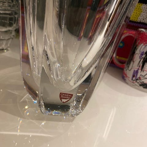 Orrefors vase i krystal med et skåret mønster. Vasen er klar og har en dekorativ kant. Velegnet til blomsterarrangementer eller som dekorativ genstand.