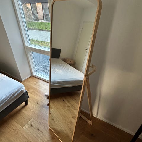 IKEA gulvspejl med træramme. Spejlet er fritstående med et enkelt design, der gør det velegnet til forskellige rum og indretninger.
